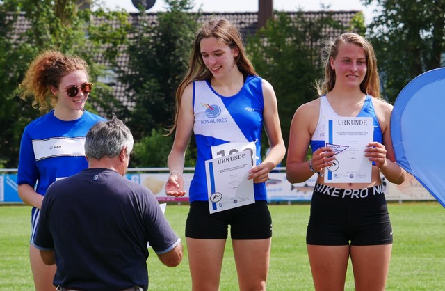 In den Wurfdisziplinen zeigte sich dann wieder die Stärke der LG, denn dort lieferten sich bei den wU18 Mia Bergmiller, Paula Nägler und Julia Vogtmann einen „internen“ Kampf um die Podestplätze. Während im Speer Mia Bermiller mit neuer Bestleistung von 33,56 Metern die Nase vorn hatte, entschied Julia Vogtmann (TSV Mönchsdeggingen) Kugel (11,09m) und Diskus (27,63m) für sich. Auch ihr war dabei deutlich die lange Saison anzumerken.