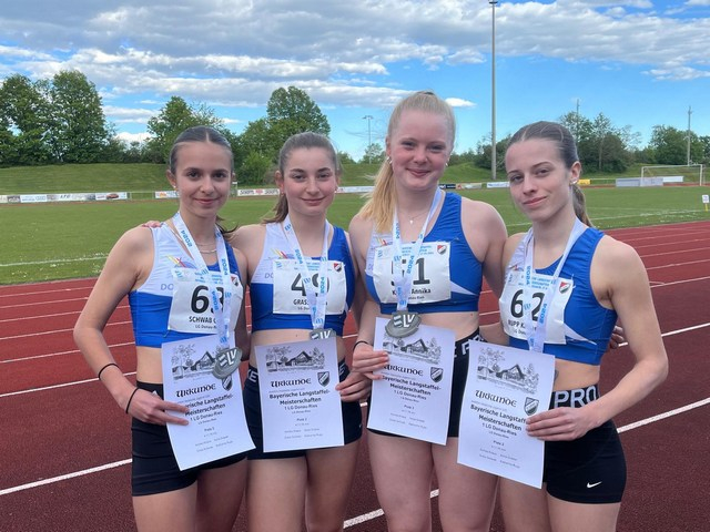 Die jüngsten Athleten schickte der TSV Nördlingen in der Altersklasse wU20 über die 4x400m ins Feld. Mit Anna Grasse, Katharina Rupp und Annika Knaus traten dabei drei sehr erfahrene 400-Meter-Läuferinnen an, während Greta Schwab ihren ersten großen Wettkampf absolvierte. In einer ansprechenden Zeit von 4:11,76 Minuten wurden die 4 Damen Bayerische Vizemeister.