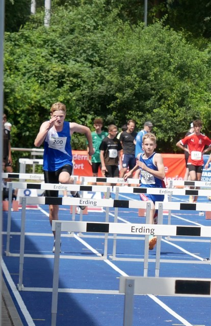In der gleichen Altersklasse qualifizierte sich Jonathan Federle (TSV Rain) für den Hochsprung und die 80mHürden. Um die Kräfte besser einzuteilen, verzichtete Jonathan bei seinen ersten Bayerischen Meisterschaften auf den Hochsprung und konzentrierte sich in den letzten Trainingseinheiten auf den Hürdenlauf. Das sollte sich auszahlen. So steigerte er sich im Vorlauf um fast eine halbe Sekunde und erreichte somit nach einem technisch sauberen und konzentrierten Lauf in 12,45 Sekunden das Finale. Dort musste er der Anstrengung etwas Tribut zollen. Aber mit der Zeit aus dem Finallauf (12,74 Sek) unterbot er erneut seine Qualifikationsleistung und belohnte sich mit dem achten Platz.