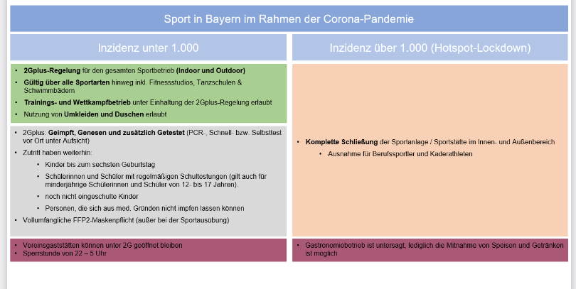 Die ab heute gültige Bayerische Infektionsschutzverordnung bestimmt, dass bei Sportveranstaltungen nur noch Personen teilnehmen bzw. anwesend sein dürfen, die zusätzlich zum Status geimpft/genesen auch einen tagesaktuellen negativen Antigen-Test vorweisen können.