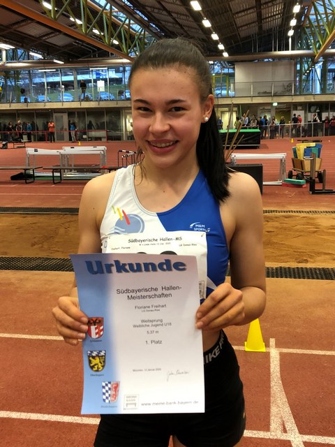 Bei den Südbayerischen Hallenleichtathletikmeisterschaften der U18 in München waren auch Athleten der LG Donau Ries am Start. Erfolgreichste Athletin war Floriane Freihart: Sie wurde südbayerische Meisterin im Weitsprung, im 60m Sprint konnte sie sich den Vizetitel holen.