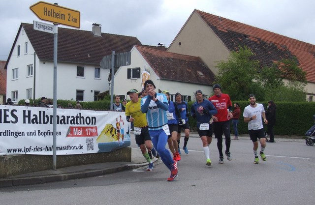 Bereits beim Start auf dem Marktplatz in Bopfingen kam das Gefühl einer Großveranstaltung auf, als das Feld der Athleten, das den gesamten Marktplatz gefüllt hatte, sich erst nach und nach in die Länge zog und es fast eine Minute dauerte, bis der letzte Läufer, begleitet von lautstarker und fetziger Partymusik, die Startlinie überschritten hatte. Mittels eines in die Startnummer integrierten Transponders wurde aber für jeden die persönliche Zeit exakt bestimmt. Nach einer Runde durch die Bopfinger Innenstadt ging es auf asphaltierten Rad- und Feldwegen hinaus auf die freie Flur. Dabei zeigte sich, dass mit diesem Wettkampf nicht nur Spitzenathleten angesprochen wurden, sondern auch ein breites Feld von Hobby-und Freizeitsportlern auf die Strecke ging. Auf den ersten 10 Kilometern, vorbei an Flochberg, über Trochtelfingen und Utzmemmingen nach Nähermemmingen, wo bereits die Hälfte der Gesamtstrecke bewältigt war, zeigte sich das Läuferfeld noch als dichter Wurm, der sich durch die Landschaft zog. Alle ambitionierten Athleten, die den Halbmarathon in einer Zeit zwischen 1:30, 1:45, 2:00 und erstmals 2:15 Stunden bestreiten wollten, konnten sich an den „Pacemakern“ orientieren. Diese waren an den orangen Fahnen und den gelben Leuchtshirts zu erkennen, auf denen die anvisierte Zielzeit aufgedruckt war.