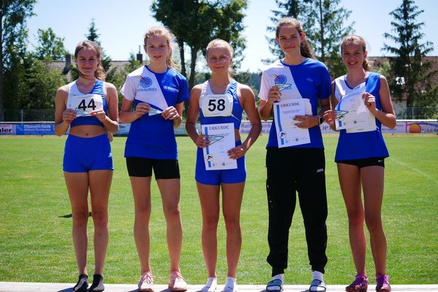 Bei den gleichaltrigen Mädchen waren mit dafür mit Emma Krämer, Magdalena Fischer, Ellie Ströbel, Maxima Peer, Pauline Rossmann, Annalena Viebranz, Melanie Theiner und Jessica Rauter gleich 8 Athletinnen für die Mannschaft am Start. Melanie Theiner hatte an dem Tag wenig Vertrauen in das eigene Können und blieb mit 1,40m im Hoch, 4,09m im Weit, 6,64m unter ihren Möglichkeiten. Am Ende erreichte sie mit 1676 Pkt. den undankbaren 4. Platz. Umso größer war die Freude über den Mannschaftstitel zusammen mit Magdalena Fischer, Maxima Peer, Ellie Ströbele und Jessica Rauter. Erfreulich waren dabei auch die persönlichen Bestleistungen von Jessica über 100m (13,96 sec) und im Hochsprung (1,40m). Leider brachte sie an dem Tag keine Kraft hinter die Kugel, sonst wäre ihr der Titel nicht mehr zu nehmen gewesen.