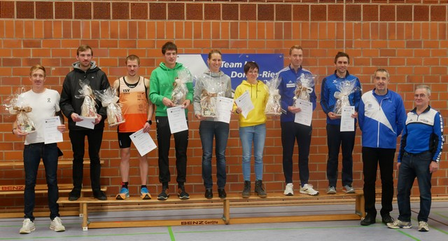 Die Siegerehrung des Einzellaufes und der Serie erfolgte dann in einem würdigen Rahmen in der gut vorbereiteten Wörnitzhalle. Dort hatten alle Läufer und Zuschauer ausreichend Zeit wieder warm zu werden und sich an dem reichlichen Speisenbüffet zu stärken. Neben den Ehrungen der Einzelläufe und der Seriensieger in allen Altersklassen, erfolgte auch die Ehrung der langjährigen Teilnehmer. So erhielten Konrad Deiner und Franz Oschwald eine Auszeichnung für die Teilnahme an 150 Läufen, während Renate Hingst für den 200. Lauf geehrt wurde. Gemeinsamer Sport hält jung. Das zeigte sich auch in der Altersklassenwertung, welche bis zu den M75 vorgenommen wurden. Hier gewann die Serie Franz Kelz (LG Warching) vor Hannes Hingst (TSV Harburg).
