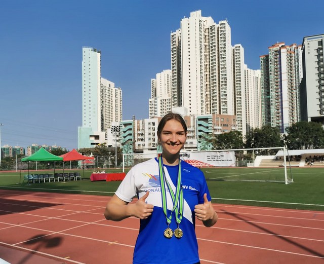 Tamara Feder, die sich derzeit für ein Auslandssemester in Honkong aufhält, gewann bei den dortingen Hochschulmeisterschaften im Diskus und im Kugelstoßen und präsentiert hier bei gekonnt die LG Donau-Ries.